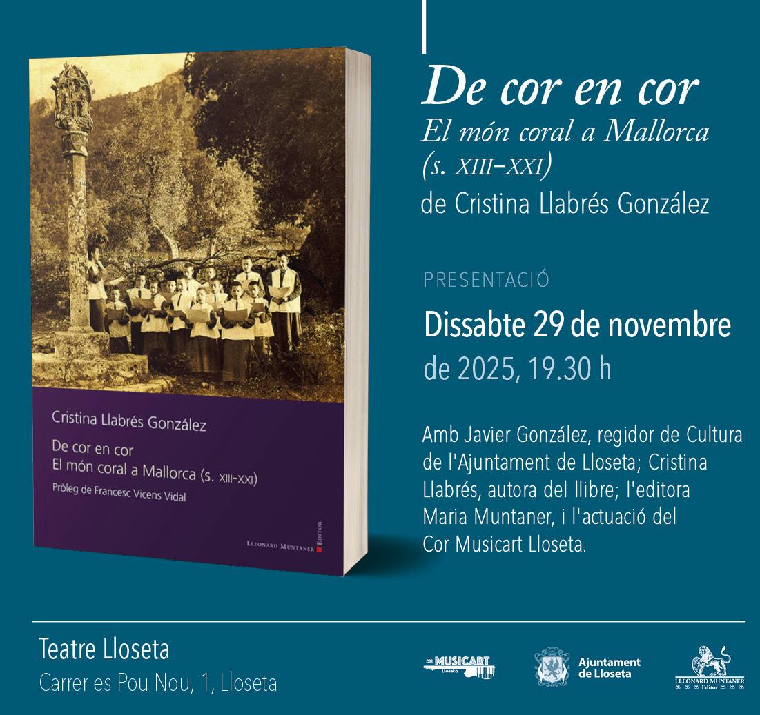 L’acte comptarà amb la presència de Javier González, regidor de Cultura de l’Ajuntament de Lloseta; Cristina Llabrés, autora del llibre; Maria Muntaner, editora; i l’actuació especial del Cor Musicart Lloseta.