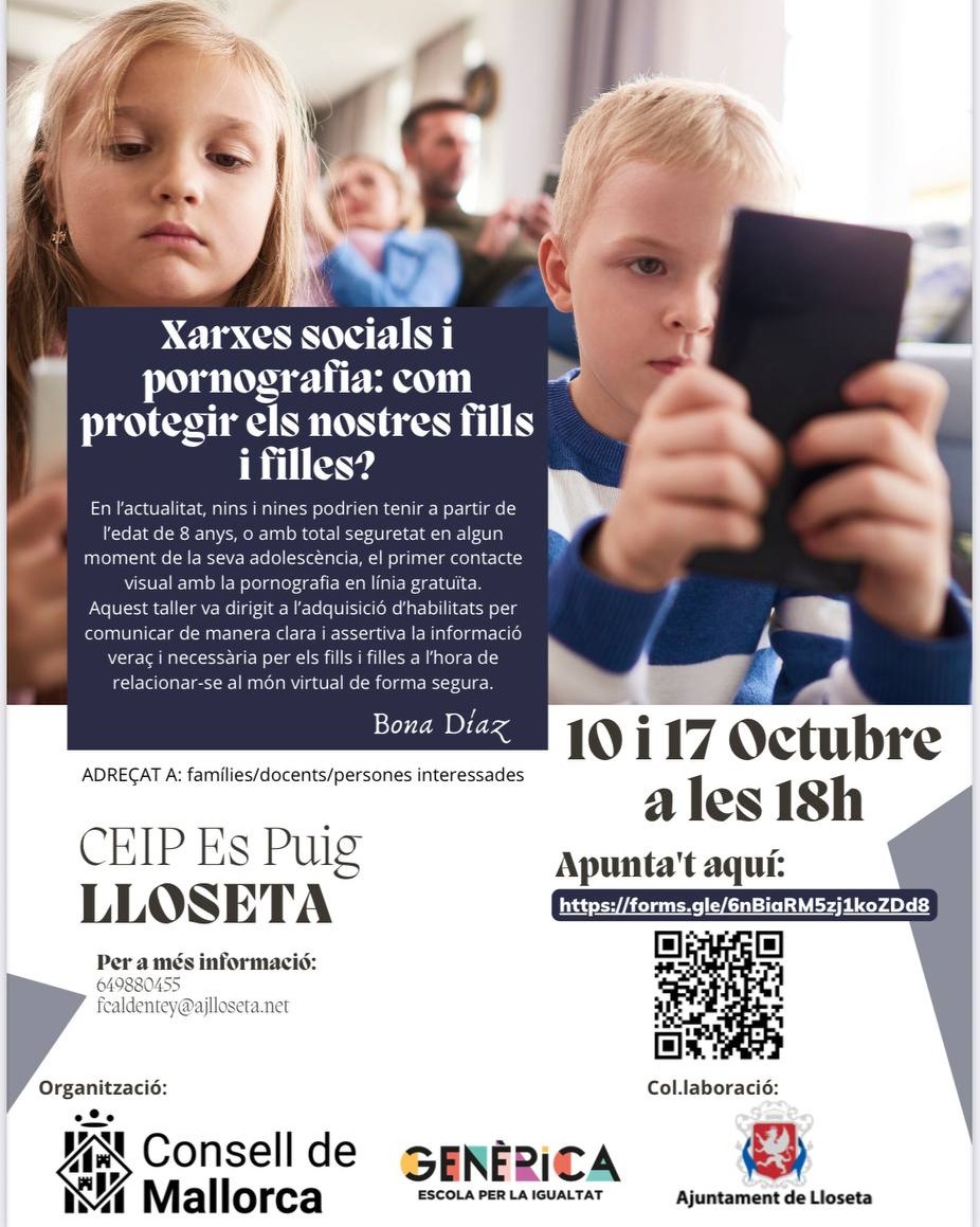 La Regidoria d'Igualtat de l'Ajuntament de Lloseta organitza, juntament amb Genèrica, el taller: "Xarxes socials i pornografia: com protegir els nostres fills i filles".