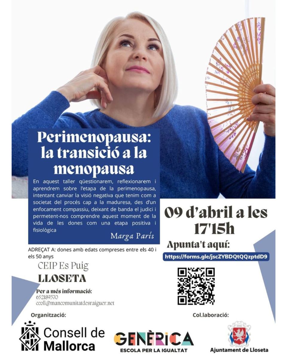 Tens entre 40 i 50 anys? Et convidam a un taller per qüestionar, reflexionar i aprendre sobre la perimenopausa, una etapa de transició sovint vista amb una càrrega negativa. Amb la guia de Marga Paris, treballarem per canviar aquesta perspectiva i entendre-la des d’un punt de vista més positiu i conscient.
