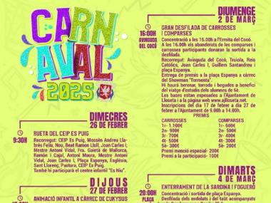Des de la rueta dels més petits fins a la gran desfilada de carrosses, Lloseta es prepara per a uns dies de festa grossa! Ball de màscares, animació infantil, concurs de disfresses i fins i tot un tardeo carnavalero per moure l’esquelet fins ben entrada la nit.