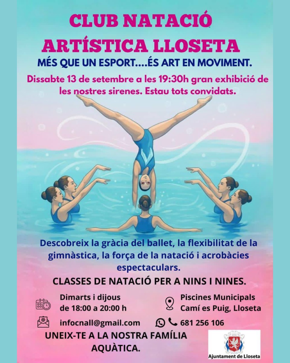 Aquest dissabte 13 de setembre a les 19:30 h, el Club Natació Artística Lloseta ens convida a gaudir d’una gran exhibició a les piscines municipals.