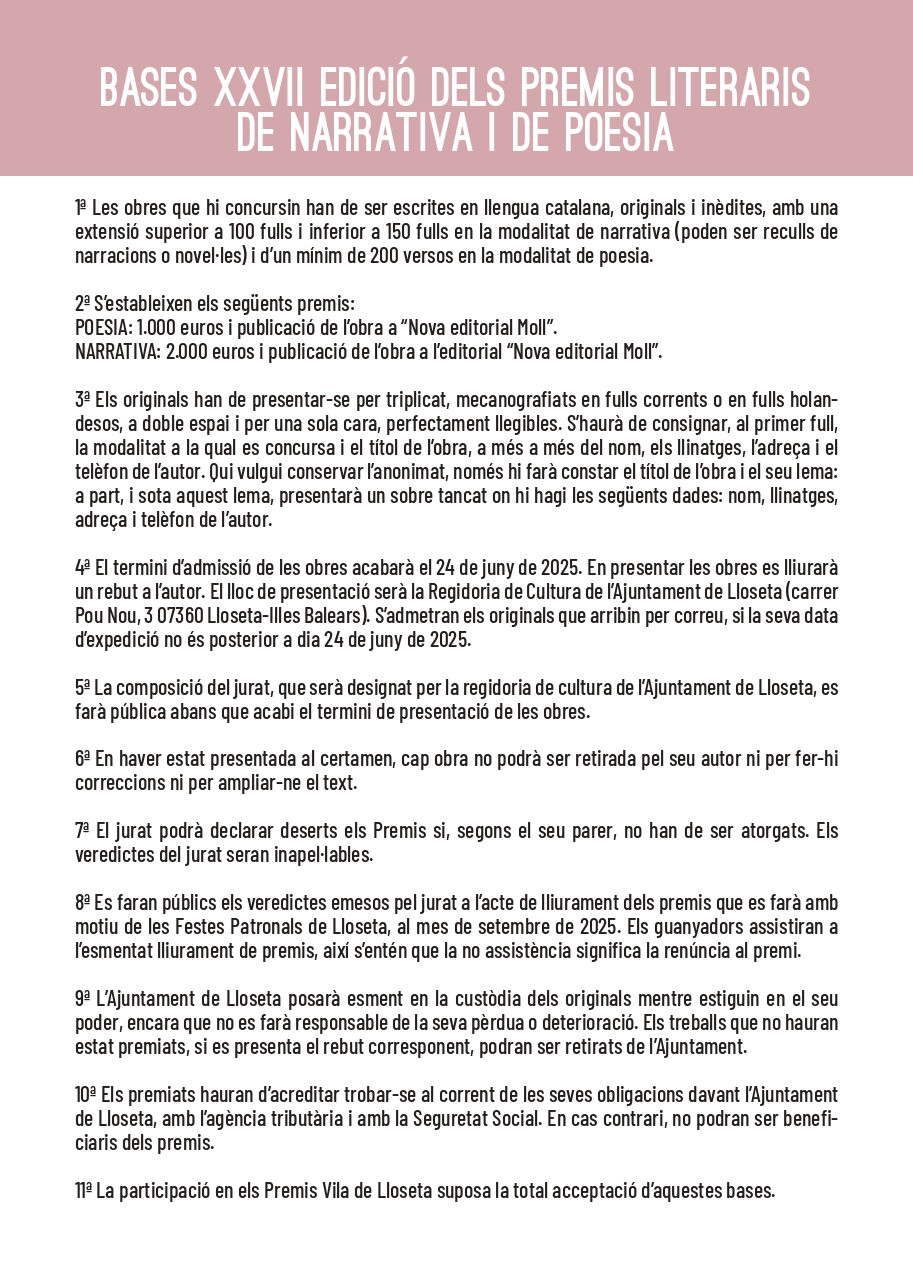 Les obres s’hauran de presentar abans del 24 de juny de 2025, per triplicat, mecanografiades, a doble espai i per una sola cara. Es podran lliurar presencialment a la Regidoria de Cultura de l’Ajuntament de Lloseta (carrer Pou Nou, 3 – 07360 Lloseta) o per correu postal. També s’accepten presentacions sota pseudònim, amb les dades personals dins un sobre tancat.