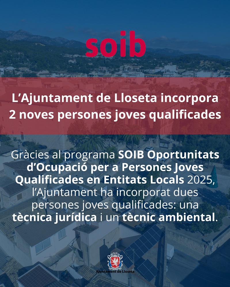 L’Ajuntament de Lloseta gràcies al programa «SOIB Oportunitats d’Ocupació per a Persones Joves Qualificades en Entitats Locals 2025»; incorpora a dos tècnic, una tècnica jurídica i una tècnic ambiental.