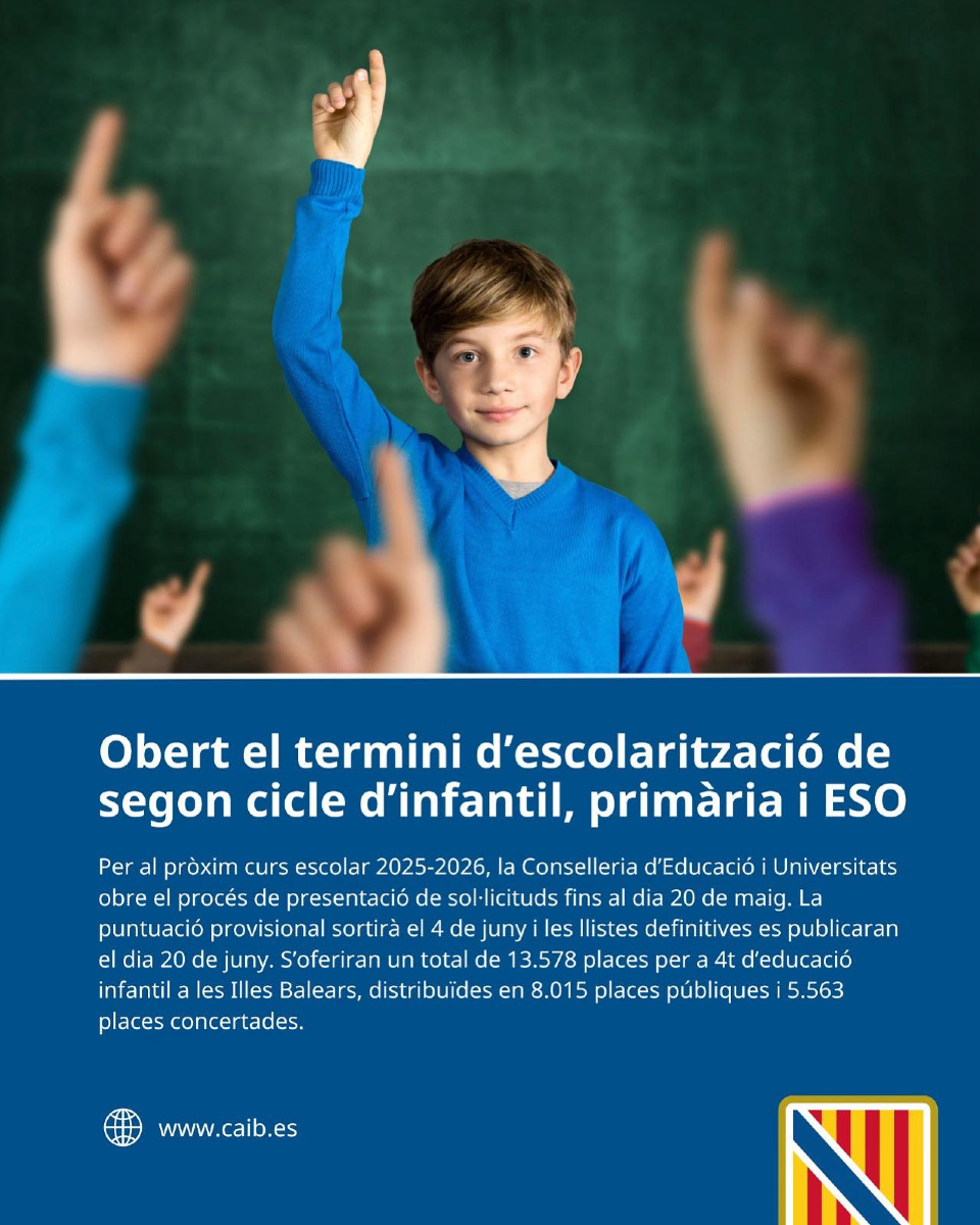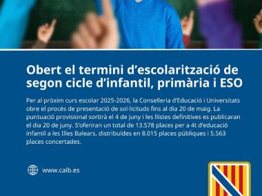 Des d’avui, 12 de maig, i fins al 20 de maig, s’obre el termini per sol·licitar plaça escolar per al curs 2025/2026.
