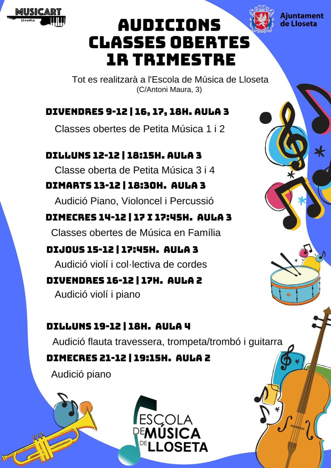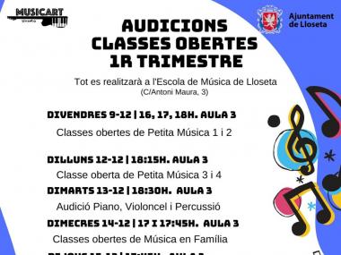 Aquí teniu el llistat de les diferents audicions que es faran al llarg d’aquesta setmana i la que ve, sempre a l’Escola de Música (C/Antoni Maura, 3).